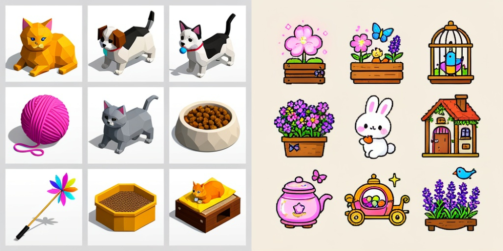 User prompt: 生成一套动物养成游戏的 icon,包括小猫小狗、饭盆等元素。画风要 3d low poly 风格。